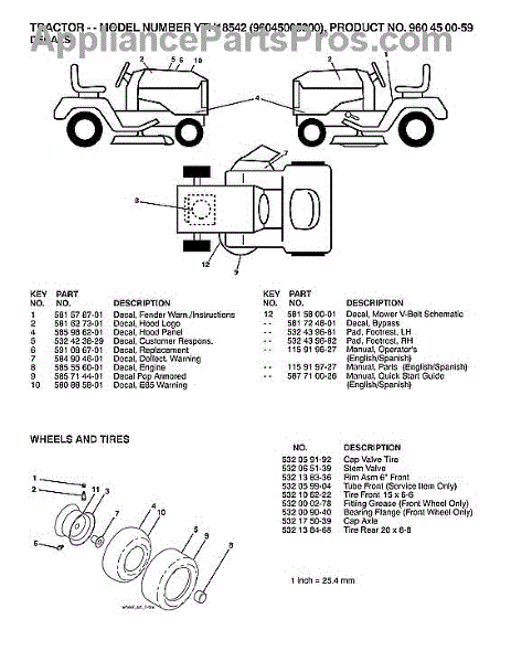 This is a rear tire for a lawn mower or lawn tractor. Tires are critical to the smooth, comfortable operation of a lawn mower, and their lifespan depends on how they are used. Lawn mower tires that are used more frequently, or on rougher terrain, will typically have a shorter lifespan. Lawn mower tires may lose traction over time with repeated use. They may also weaken and be unable to hold air pressure for long periods of time. Occasionally, a lawn mower tire may become punctured or damaged. Lawn mower tires may also degrade through exposure to extreme weather conditions, such as heat, rain, wind, and cold. A visual inspection can help determine whether it is time to replace the tire. Depending on the condition of the tires, it might be necessary to replace both rear tires at once. This can ensure a smooth, even mowing experience, and prevent additional damage to the mower. This lawn mower tire is an OEM part sourced directly from the manufacturer, and it is sold individually. It is compatible with lawn mowers and lawn tractors made by Jonsered, Poulan, Ariens, Husqvarna, Craftsman, Rally, Yard Pro, Murray, Ryobi, Weed Eater, Western Auto, Companion, and Southern States.