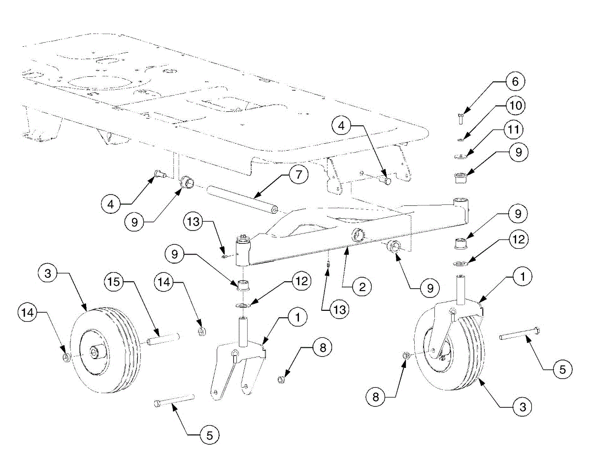 Caster yoke assembly for rear-engine and zero-turn riding mowers. Mounts the front caster wheel to the mower deck. Replace if cracked, bent, or worn.