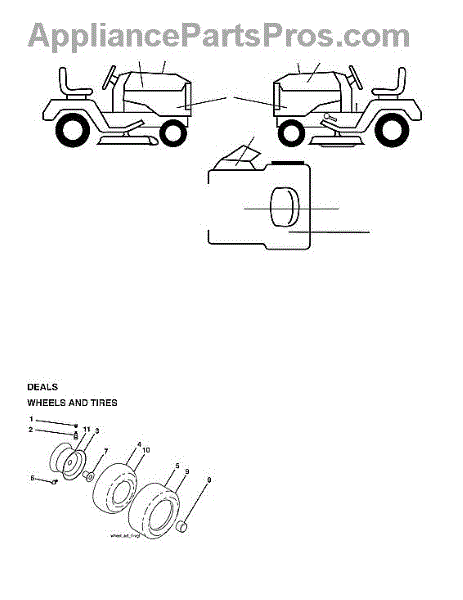 Rear tire for riding mowers and lawn tractors. Replace when tread is worn, tire loses air frequently, or vibration occurs during operation. Verify fit with your model number before ordering.
