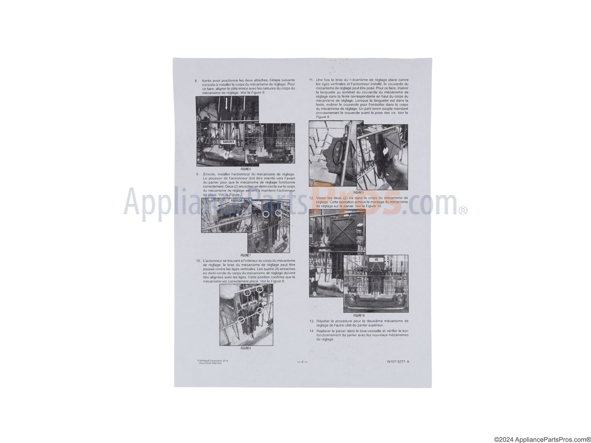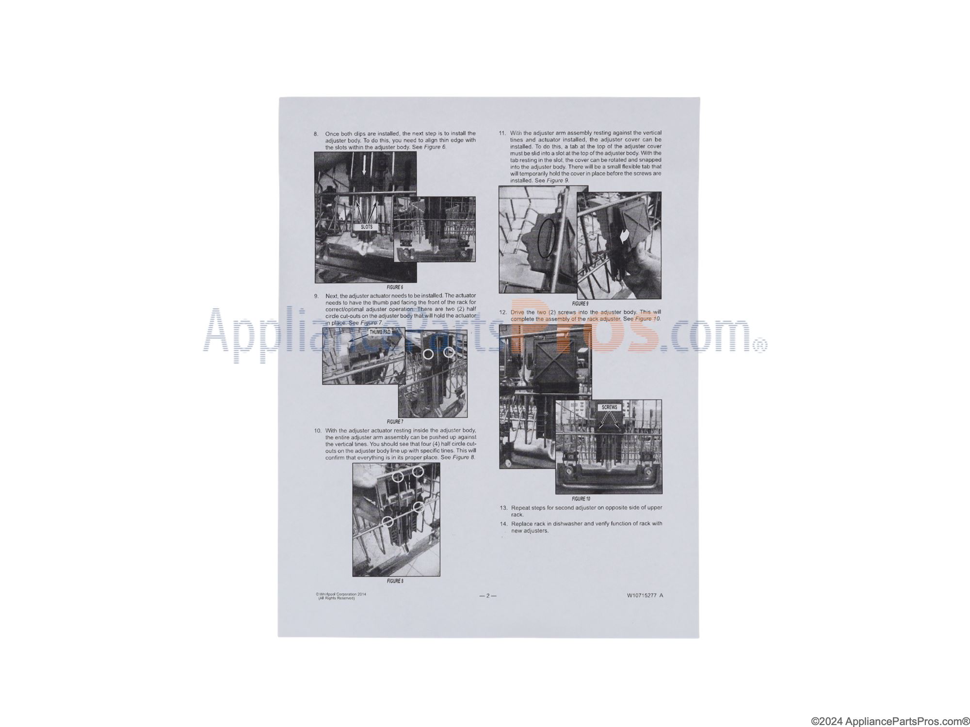 Mike C Bowling Green , KY January 03, 2020 Appliance: Whirlpool Dishwasher WDT780SAEM1 Top rack wheels broken off one side The repair kit has everything needed for both sides of the rack but there were no instructions so it took me some time to figure out how it all mounted on the basket. The original design was totally different than the repair kit so it would have been very beneficial to have at least a diagram that showed how everything fit together. That being said, once I figured out how all the parts fit, then it was a very easy repair. You won't reuse any of the old parts except for the end caps that snap on to the ends of the wheel tracks. You'll need a flat-blade screwdriver and a star bit that comes with the repair kit. Take out the entire top basket by removing the end caps from the wheel tracks. Try not to break or throw away the end caps, you will reuse these. Do one side at a time so you can get an idea of where the new wheels and brackets are supposed to be positioned on the basket. There is no left or right side, both sides are exactly the same parts. The old parts basically just unsnap from the basket, I used the screwdriver to help unsnap the old parts. Once those are off then you can start assembling the adjuster. Long plastic piece attaches to the inside of the basket, the metal adjuster slides into the long plastic piece, insert adjuster lever, then screw on the smaller plastic piece on the outside of the basket that holds the entire assembly together. Repeat for the other side. I highly recommend replacing both sides so the repair will last. These are much more robust parts than the originals so they should last several years. Read More... 320 People found this story helpful Do-It-Yourself Rating: Repair Time Estimate: 15-30 minutes Tools: Screwdrivers, Socket Set