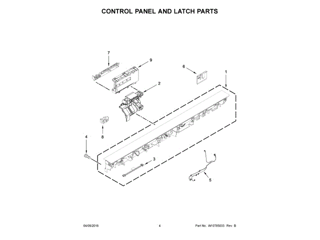 The Control Panel is an OEM part for Whirlpool dishwashers. Located at the top center, it houses the electronic buttons controlling cycle, option, and start selections.