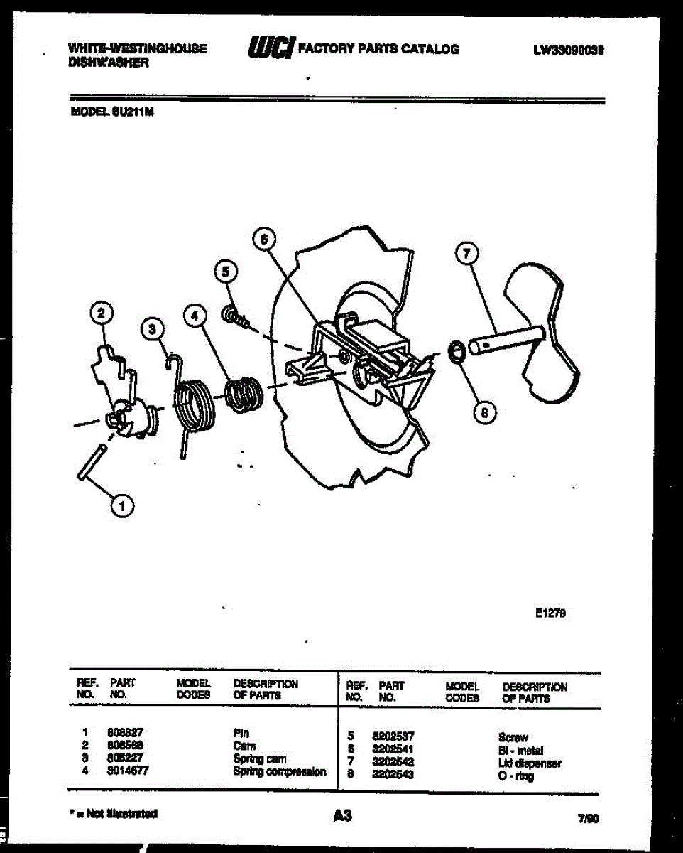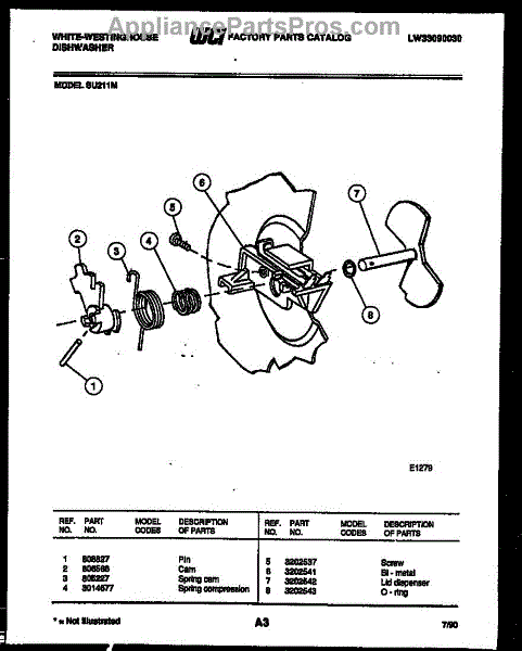 Spring cam for dishwasher door latch mechanism. Replace this small structural component if cracked, broken, or missing to restore proper door operation.