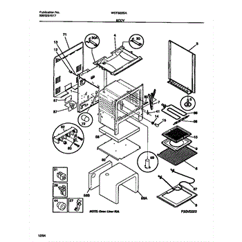 Insulation blanket surrounds the oven cavity to retain heat. Replace if burnt, deteriorated, or damaged by pests to restore proper heat retention.