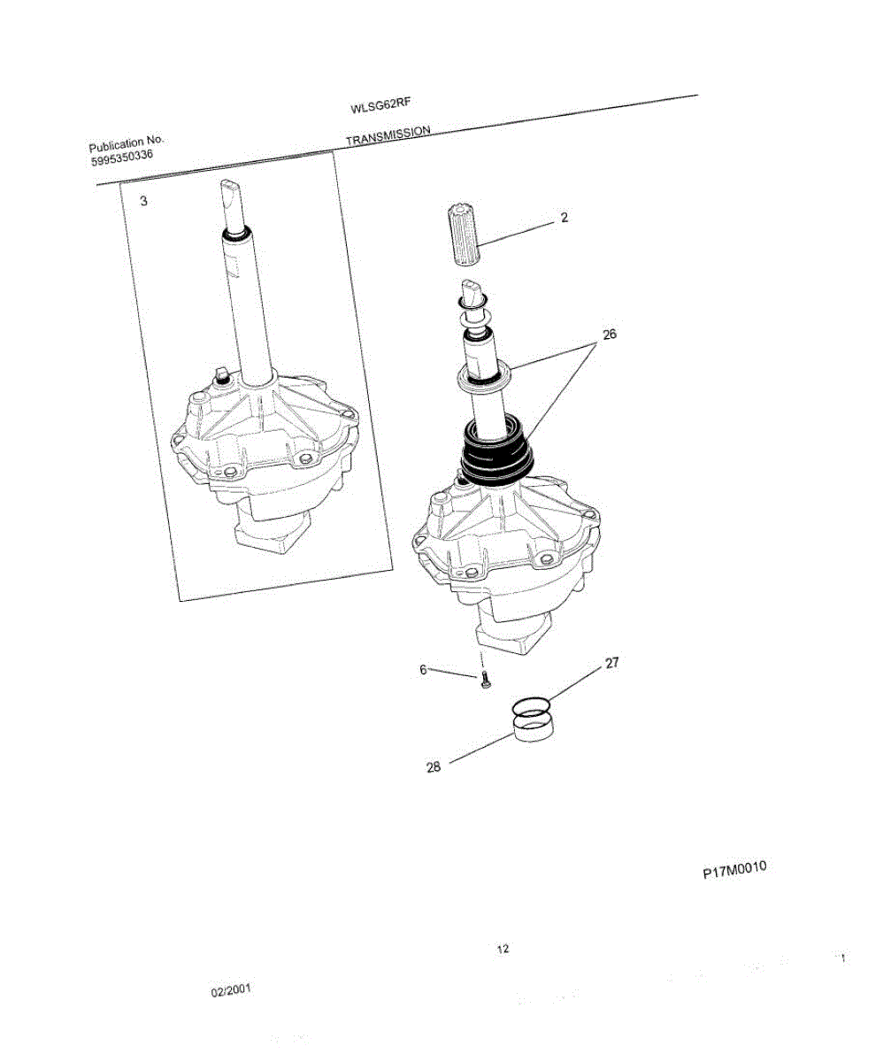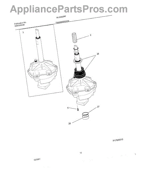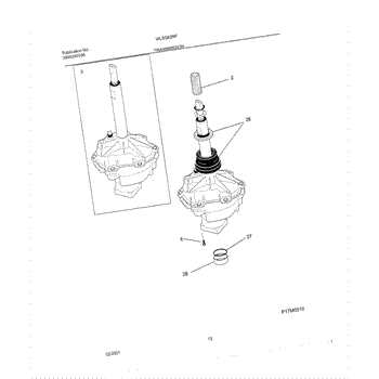 This transmission assembly drives the agitation and spin cycles by transferring motor power to the tub. Replacing a worn transmission helps restore proper wash action and spin performance.