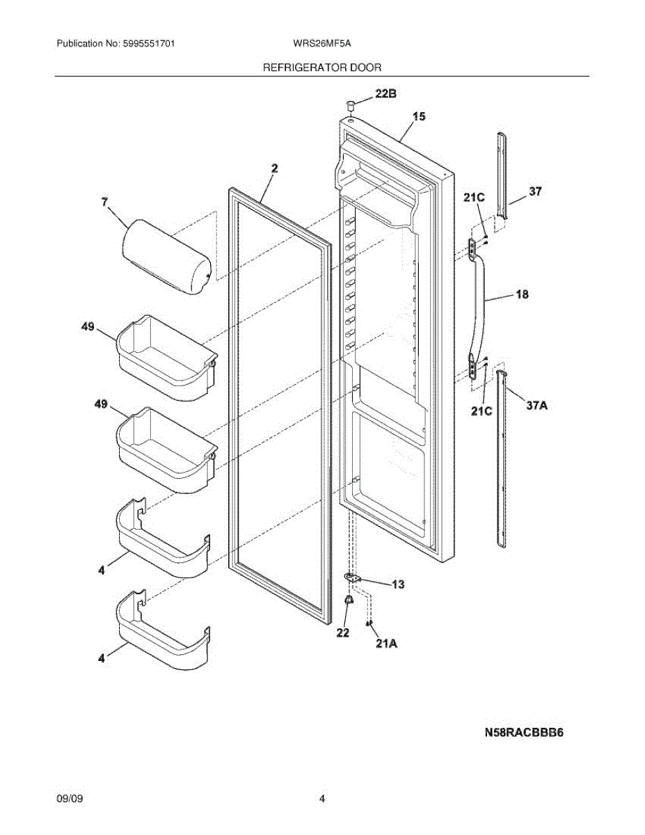 Replacement door bin for refrigerator interior storage. Installs on door to hold condiments and beverages. Replace if cracked, broken, or fallen off.