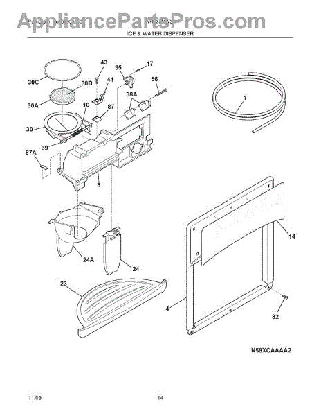 The Ice Chute Door Insulation is an OEM replacement part for Frigidaire refrigerators. It is installed on the ice chute door to prevent warm air infiltration and moisture buildup around the ice dispenser. Causes may include compression or cracking of insulating foam/material from normal use stress. Spills exposing it to liquid are also damaging. Symptoms of defective insulation consist of: