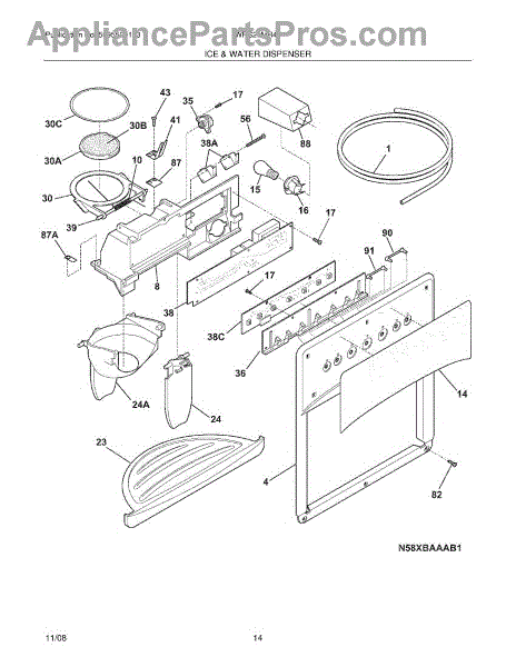 The Ice Chute Door Insulation is an OEM replacement part for Frigidaire refrigerators. It is installed on the ice chute door to prevent warm air infiltration and moisture buildup around the ice dispenser. Causes may include compression or cracking of insulating foam/material from normal use stress. Spills exposing it to liquid are also damaging. Symptoms of defective insulation consist of:
