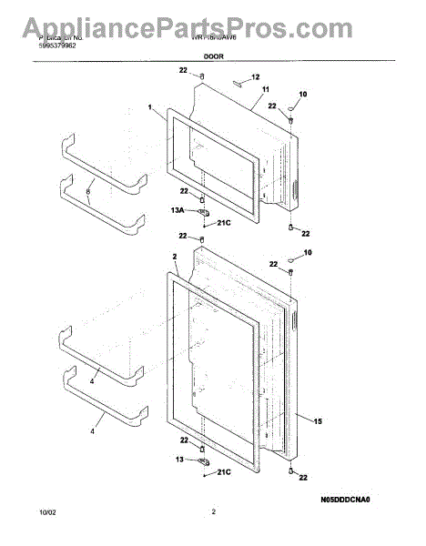 This door stop limits the opening angle of the refrigerator/freezer door to prevent overextension that can stress hinges or strike nearby cabinets. Replacing a worn or missing stop restores controlled door travel and helps prevent impact damage.