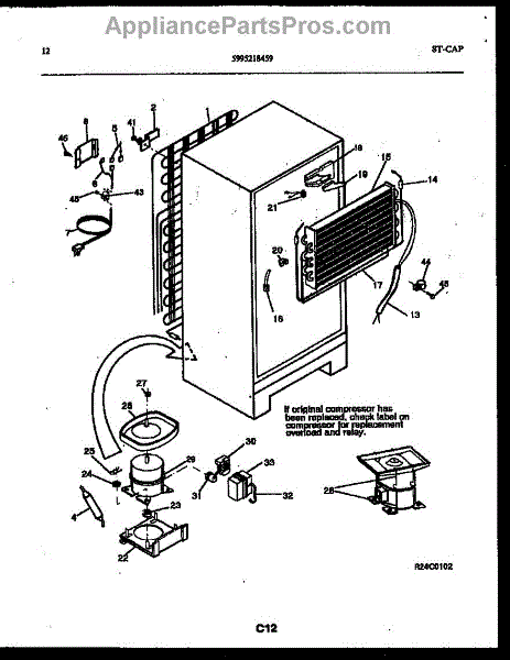 This is a compressor used in several types of home appliances. The compressor is designed to take cold gas in the appliance and place it under pressure so the gas raises in temperature. It is then moved through the refrigerator system to ensure the unit stays cold throughout the appliance. This part can become damaged or malfunction, which may cause the motor to stop running, make the motor noisier, or cause the motor to never stop running.If this happens, the compressor will need to be replaced. A basic set of tools will be needed. A pair of work gloves can also be useful. First, locate the compressor as it may be in various locations depending on the appliance model. Unplug the appliance before removing the compressor. Install the new compressor using the original bolts and nuts before turning the power back on and resuming normal use.This part is sold on an individual basis. The compressor is made to be used with refrigerators, ranges, stoves, ovens, air conditioners, and freezers created by Gibson, Frigidaire, Kelvinator, Montgomery Wards, Westinghouse, Tappan, JCPenney, Universal, and Kenmore. It is an authentic OEM replacement part directly sourced from the manufacturer.