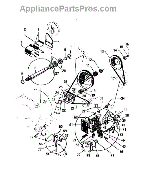 Main drive belt transfers motor power to spin the drum. Replace when belt is worn, cracked, or broken to restore normal operation. Verify fit by model.