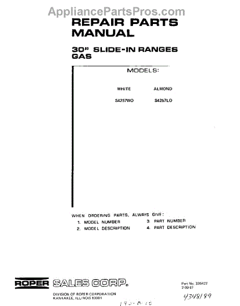 Parts for Roper S4257W0: 01 - Wire Harness , Rear Main Top Fille Parts